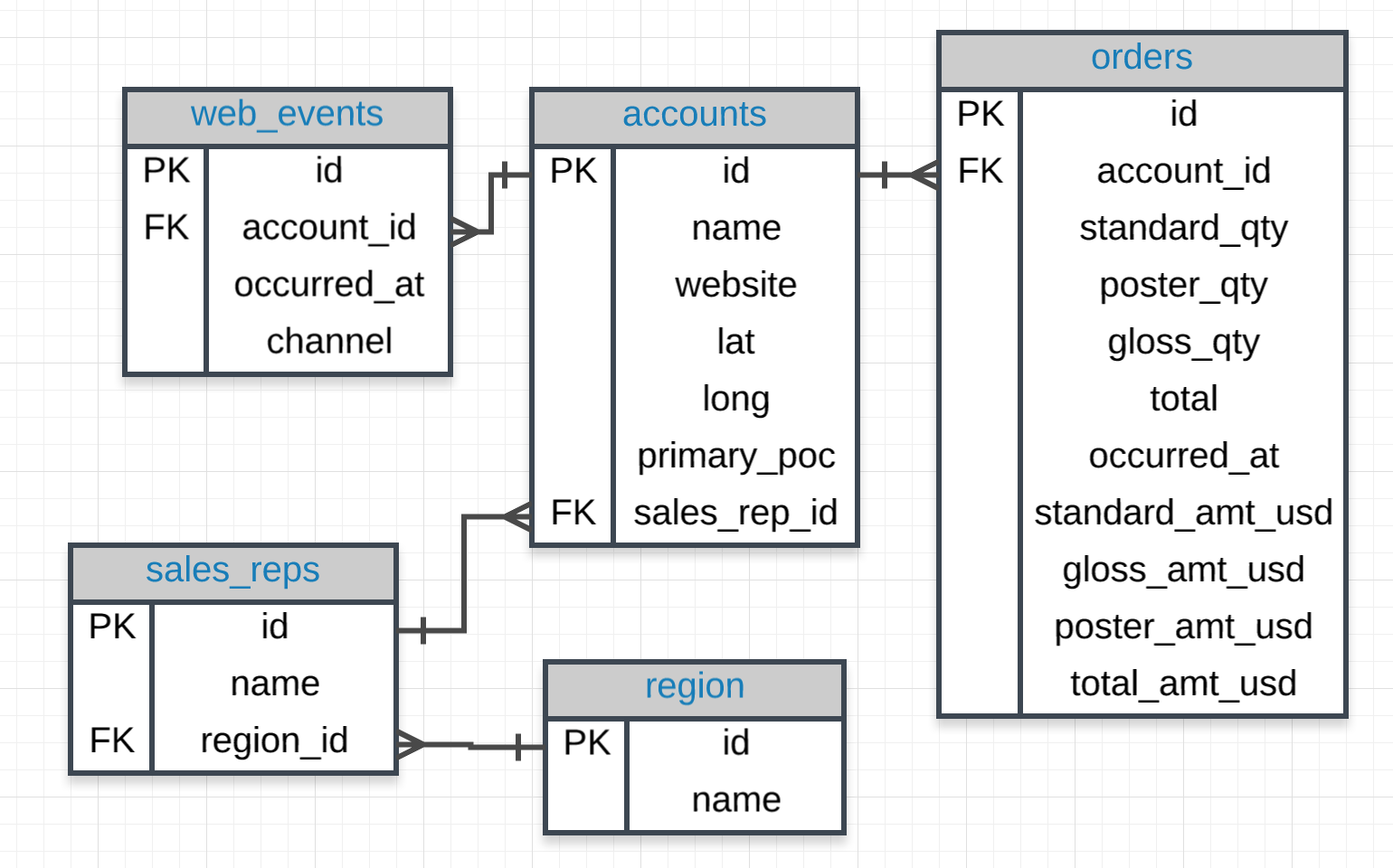 Now that you have been introduced to JOINs, let's practice to build your skills and comfort with this new tool. Below I have provided the ERD and a bunch of questions. The solutions for the questions can be found on the next concept for you to check your answers or just in case you get stuck!