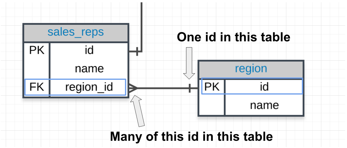 - The crow's foot shows that the FK can actually appear in many rows in the sales_reps table.